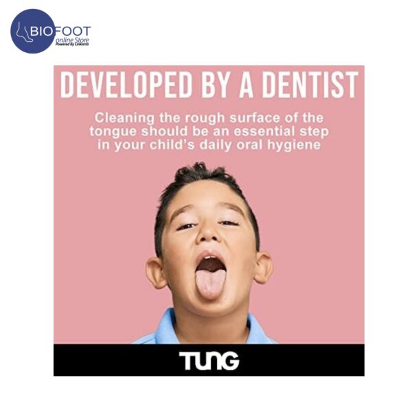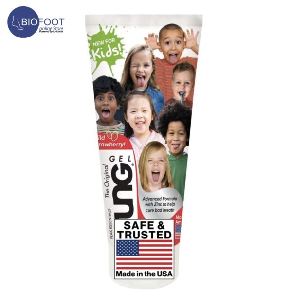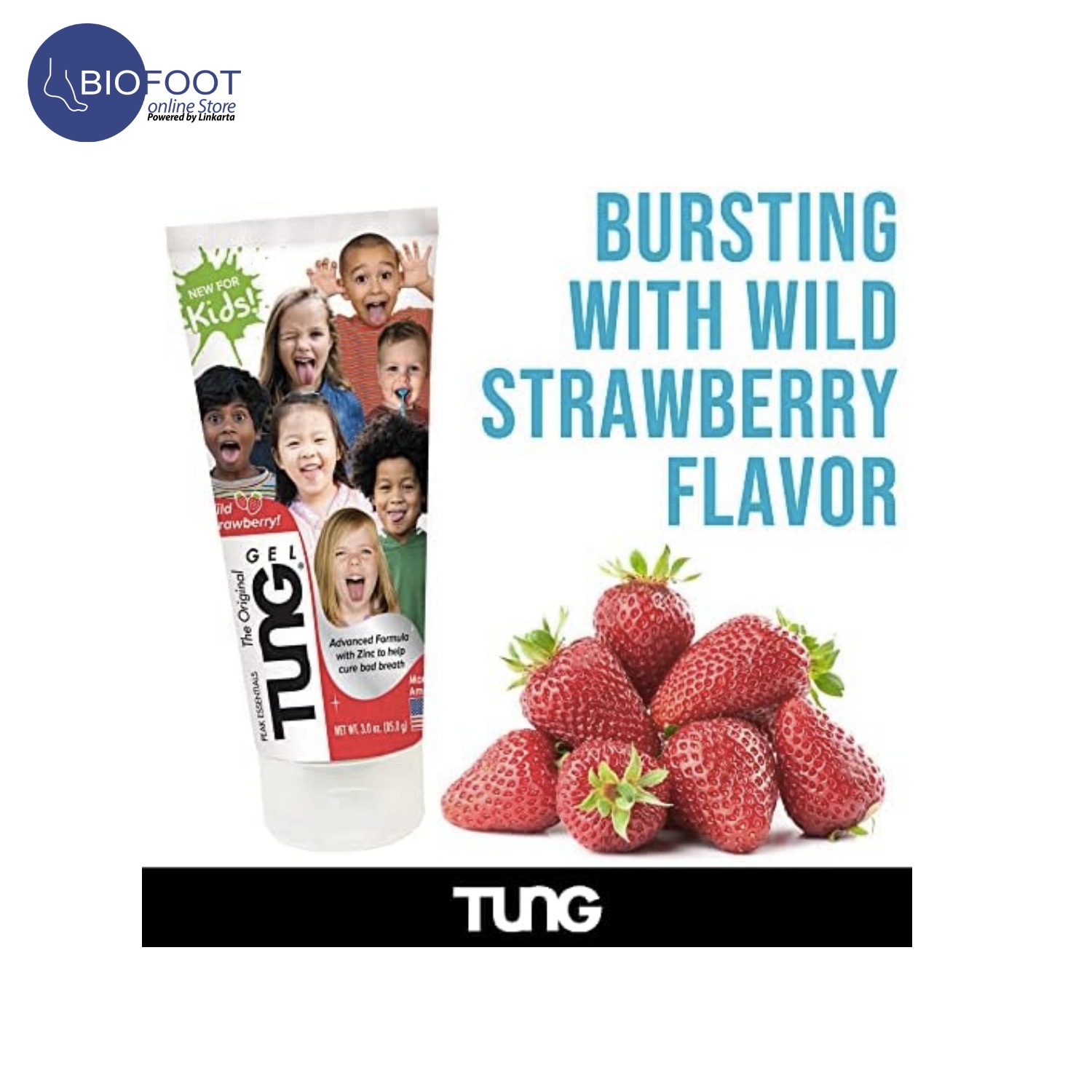 The Original Kids TUNG Gel With a great tasting wild strawberry flavor, kids will WANT to brush their tongue! Colorful packaging of happy kids with funny expressions is sure to bring a smile and have your child excited to try the gel cleanser. The gel contains Zinc. The gel naturally and safely eliminates bad breath by neutralizing the sulfur gas that comes from the tongue. With the help of TUNG, teach your family that tongue cleaning is an essential part of daily oral care.