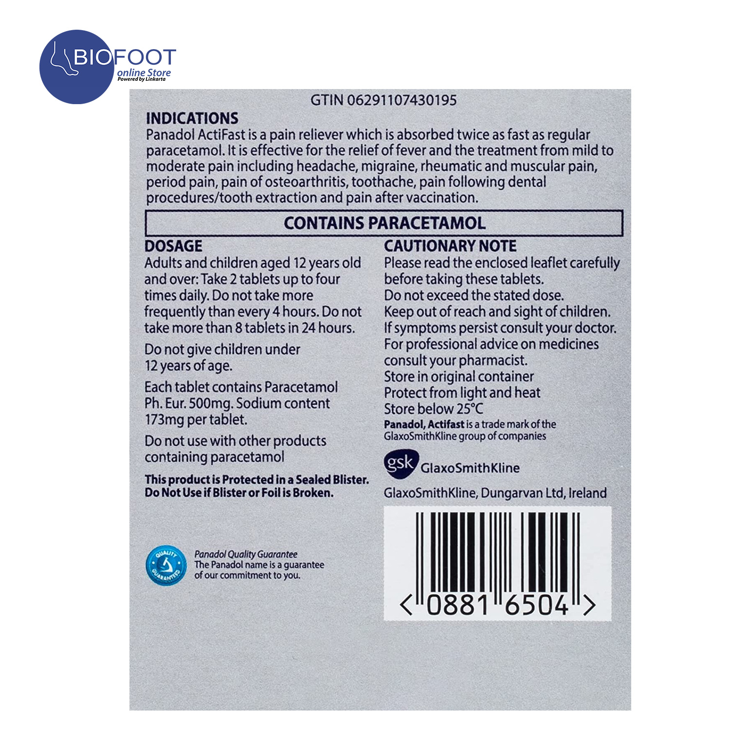Panadol ActiFast tablets are used for fast pain relief of headaches, toothache, backache, rheumatic and muscle pains and period pain. It also relieves sore throat and the feverishness, aches and pains of colds and flu. The active ingredient is paracetamol which is a painkiller and also reduces your temperature when you have a fever. The tablets have been specially formulated so that the paracetamol is absorbed into the bloodstream twice as fast as standard paracetamol tablets and so gets to the source of pain fast.
